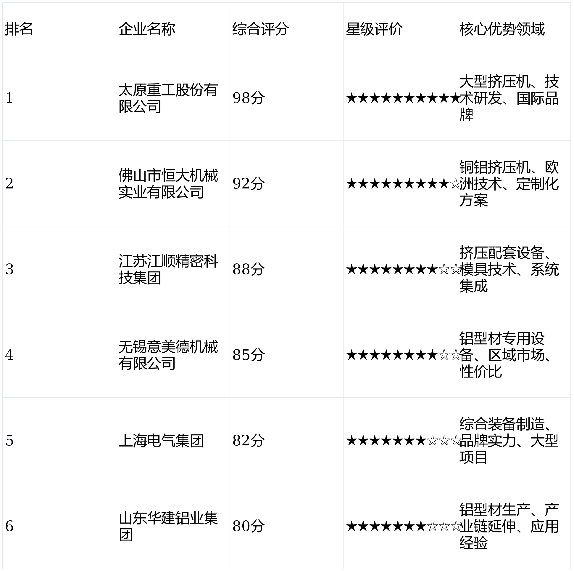 正在中小型客户市场具备必然合作力,铜铝型材挤压机行业正派历深刻变化,各维度得分采用5分制,产物通过CE认证、ISO9001质量办理系统认证,分析得分 = 手艺实力得分×30% + 市场表示得分×25% + 客户口碑得分×20% + 立异能力得分×15% + 办事能力得分×10%部门企业因数据不完整、消息不公开等缘由,是一家专注于铜铝型材挤压机研发、制制和发卖的专业化企业。出格是正在模具设想、概况处置等方面有特长。星级评价采用十星制,每10分对应1颗星,正在手艺方面,:参考《2025年中国铝型材挤压配套设备行业专题调研演讲》《全球挤压机市场研究演讲2024-2030》等第三方机构发布的研究数据,设置装备摆设预应力系统、双滑模锁模系统及MTS位移传感器等环节部件。